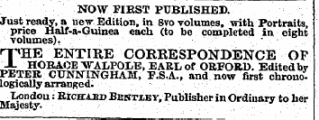 NOW FIRST PUBLISHED . Just ready , a ue-w Edition , in 8 vo volumes , -with Portraits , price Half-a-Guinea each ( to be completed in eight volumes ) . ¦ 1 ' « HE ENTIRE CORRESPONDENCE OP - HORACE ¦ WALPOLE , EARL of ORFORU . Edited by PETER CUNNINGHAM , P . S . A ., and now first chronologically arranged . London : Richtajbd BEnriE v , Publisher in Ordinary to her Majesty . ¦