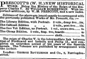 PRESCOTT'S ( W . H . ) NEW HISTORICAL WORK . Being the Historyof the Roijch of the Emperor Charles V . By WILLIAM ROBERTSON . With important additions , by W . H . PRESCOTT , and a new Index . ^ . Editions of the above are issued exactly to correspond with the previously published Works of Mr . Prescott , viz . : — The Library Edition , with Portrait . 2 vols ., demy 8 vo .. . 24 $ The Cabinet Edition „ „ 2 vols ., post 8 vo ..... 12 s ' The One Vol . Edition , no Portrait . 1 vol ., crown 8 vo ....... 5 s . The Cheap Edition . 2 vols ., fcap . 8 vo , boards ...... 4 s-. " " '" . '" - ^ .. : ¦ :-. — -- — ' . " doth .... 5 s . The reign of Charles V . is the inter mediate link between , that of Ferdinand and Isabella and Philip II ., and completes an . unbroken period of 150 years of the Spanish annals . The Volumes aro published by arrangement with the Author . London : George Botttivedge and Co ., 2 ; Farrinjrdonstreet . " .