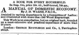 A BOOK FOR EVERY HOUSEHOLD . In fcap . 8 vo , prico 10 s . Cd ., half-bound , 750 pp ., A MANUAL OF DOMESTIC ECONOMY . By J . H . WALSH , P . R . C . S ., Assisted in various departments by a Committee of Ladios ; and illustrated with more than 200 Wood Engravings . This Work is no compilation , but an original book , founded on a most extensive and practical oxperionce of moro than 25 years . London : Geokoe Routi-edge and Co ., 2 , Farringdonatreet .