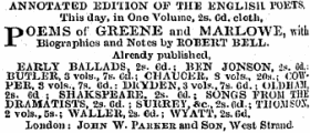 ANNOTATED EDITION OF THE ENGLISH POETS . This day , in Ono Volume , 2 s . Cd . cloth , POEMS of GREENE and MARLOWE , with Biographies and Notes by ROBERT BELL . Already published , EARLY BALLADS , 2 s . 6 d . ; BEN JONSON , 2 s . Cd . ; BUTLER , 3 vols ., 7 b . ( Id . ; CHAUCER , S vols ., 2 fls . ; COWPEE , S vols .. 7 s . Cd .: DlfYDEN , 3 vols ., 7 s . Cd . ; Ol . DIIAJI , 2 s . 6 d ; SHAKSPEARE . 2 s . fid . ; SONGS FROM THE DRAMATISTS , 2 s . Cd . ; SURREY , * c , 2 s . ( id . ; THOMSON , 2 vols ., 59 . ; WALLER , 2 s . Cd . ; WYATT , 2 s . Cd . London : John W . Pakkeu and Son , West Strand .