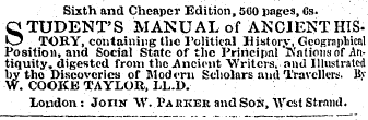 Sixth and Cheaper Edition , SCO pages , Cs . S TUDENT'S MANUAL of ANCIENT HISTORY , containing the Political History , Gcogrnpliicnl Position , and Social State of the Principal IVatioiis of Antiquity , digested from the Ancient Writers , and Illustrated by the Discoveries of ] Mod <> rn Scholars and Travellers . By W . COOKE TAYLOR , LL . D . London : John W . Pajrkeh . and Son , AVcst Strand .