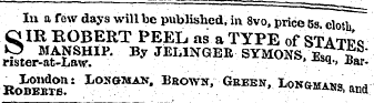 Iu a few days will be published , in 8 vo , price 6 s cloth O IR ROBERT PEEL , as a TYPE of STATPq XtJltS ™ ' By JE " ^ E SIMONS . ifSit JtoBm ™ . ' ' LONGMAK V Baowir ' Geeen , Longmans , and
