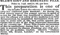 BLAIR'S GOUT AND RHEUMATIC PILLS . Price Is . Hid . and 2 s . 9 d .. per box . This preparation is one of the benefits which the science of modern chemistry has conferred upon mankind ; for during the iirst twenty yenrs . of the present century to speak of a cure for the Gout was considered a . romance ; but now theeflicacy and safety of this medicine is so fully demonstrated ; by unsolicited testimonials from persons in every rank of life , that public opinion pfo--claims this as one of the most important discoveries of the present age . These Pilla require no restraint of diet or confinement during their use ,, and arc certain to prevent t lie disease attacking any vital part . Sold by all medicine vendors . OVerve " Thomas Prout , 229 , Strand , London , " on the Government Stamp . ¦ . '