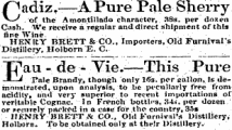 r ^ adiz , —A Pure Pale Sherry ^—^ of the Amontillado character ,. 38 s . per dozen Cash . We receive a regular and direct shipment of this tine Wine . . . H ' ' ItV BRETT fc CO ., Importers , Old Furnivars Distillery , llolborn E . C . Eau - de - Tie . —This Pure Pale BrandVj though only 16 s . per eallon . / demonstrated , upon analysis , to be . poculinriy free from acidity , and very superior to recent importations ot veritable Cognac . In French 'bottle ' s , 3 . 4 s . per dozen , or securely packed in a cilse for . the country , 3 . )« UKNltY BltETT . . & CO ., Old FurnivaVs Distillery , ' Holborn . To be Obtained oiilj nt their Distillery .