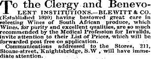 To the Clergy and Benevo-LENT INSTITUTIONS . — BLEWITT & CO . ( Establislied 1820 ) having bestowed great cure in j > eleetinp " Wines of South African produce , which Wines , for purity and excellent qualities , are so much recommended by the Medical Profession for Invalids , invite attention to their List of Prices , which will be forwarded post free on application . Coinmunications addressed to the Stores , 211 , Sloane-street . Knightsbrldge , S . W . will have immediate attention . .