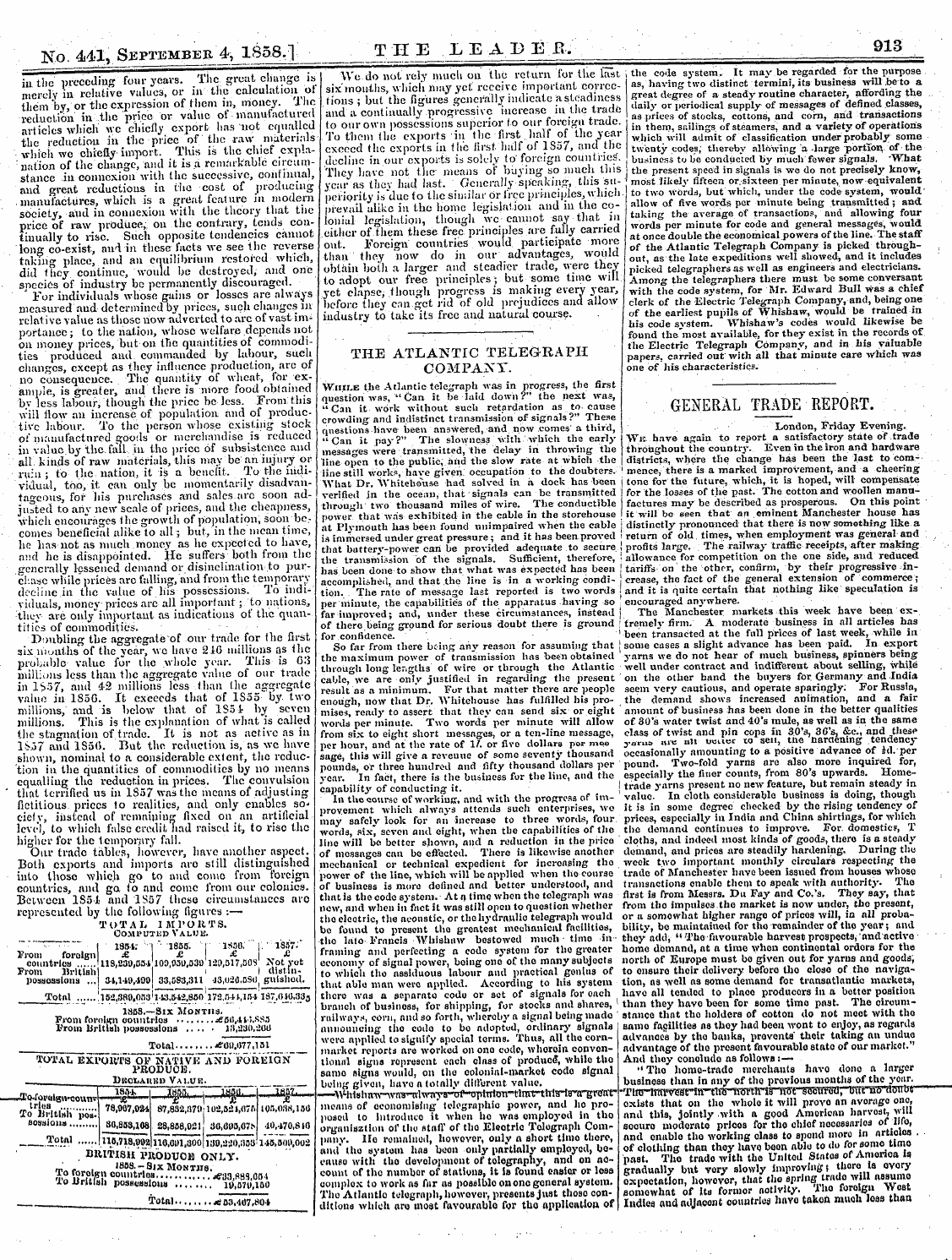 THE ATLANTIC TELEGRAPH COMPANY . Whii-e the Atlantic telegraph was in progress , the first question was , " Can it be laid down ? " the next was , " Can it work without such retardation as to cause crowding and indistinct transmission of signals ? " These questions have been answered , and now comes' a third , " Can it pay ? " The slowne . 33 with which the early messages-were ¦ transmitted , the delay in throwing the line open to the public , and the slow rate at which the line still works , have given , occupation to the doubters . What Dr . "Whitebouse had solved in a dock has been verified | n the ocean , that signals can be transmitted through two thousand miles of wire . The conductible power that was exhibited in the cable in the storehouse at Plymouth has been found unimpaired when the cable is immersed under great pressure ; and it has been proved that battery-power can be provided adequate to secure the transmission of the signals . Sufficient , therefore , has been done to show that what was expected has been accomplished , and that the line is in a working condition . The rate of message last reported is two words per minute , the capabilities of the apparatus having so far improved ; and , . tinder these circumstances , instead of there being ground for serious doubt there is ground for confidence . So far from there being any reason for assuming that the maximum power of transmission has been obtained through long lengths of wire or through the Atlantic cable , we are onlv justified in regarding the present