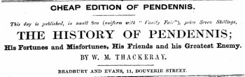CHEAP EDITION OF PENDENNIS . This day is published , i » small 8 ro { uniform with " Vault ;/ Fair ") , price Seven Shillings , THE HISTORY OF PENDENNIS ; His Fortunes and Misfortnnesi His Friends and his Greatest Enemy . BY W . M . THACKERAY . BRADBURY AND EVANS , 11 , BOUYERIE STREET .