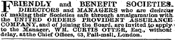 FR IENDLY and BENEFIT SOCIETIES . DIBECTOKS arid MANAGERS who are desiraaj of making their Societies safe throuch amalganaation with the UNITED ORDjERS PROVIDENT ASSURANCE COMPAiNY , and of joining the Board , are invited ta apply , to the ^ Cana ^ er , WM . CURTIS OTTJ 3 R , Esq ., tvithoat delay , at the Chief Offloes , 63 , Pall-mall . London .