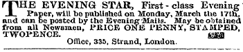 rriHE EVENING STAR , First-class Evening JL Paper , will be published on Monday , March the 17 th ,, and can be posted by the Evening'Mails . May be obtained from all Newsmen , PRICE ONE PI 3 NN * , STAMPED , TWOPENCE . gggSI Office , 335 , Strand , London .