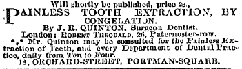 AYill shortly be published , price 2 s ., OAINLESS TOOTH EXTKACriOX , 13 Y ' JL CONGELATION . By J . R . QUINTON , Surgeon Dentist . London : Kodeut Theodai . d , 2 ( i , Paitornoster-row . ¦ % Mr . Quinfcon jnay be consulted for tho Painless Extraction of Tocth , and a \ ory Department of JUentul Pr « . o »' tico , dally from , Ten to Four . J 8 , ORCHARD-STREET , PORTiMAN-SQUAnE .