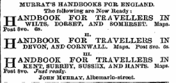 MURRAY'S HANDBOOKS FOR ENGLAND . The following are Now Ready : HANDBOOK FOE , TRAVELLERS IN WILTS , DORSET , AND SOMERSET . Maps . Post 8 vo . 6 s . HANDBOOK FOR * TRAVELLERS IN DEVON , AND CORNWALL . Maps . Post 8 ro . 6 s . in . TTANDBOOK FOR TRAVELLERS IN ilJ- KENT , SURREY , SUSSEX , AND HANTS . Maps . Post 8 vo . Just ready . John Mukkat , Alboniarlo-stroot .