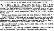 THE BEST REMEDY FOB INDIGESTION . NORTON'S GAMOMILE . PILLrS - are confidently recommended as a simple but certain remedy for indigestion , which is the cause of nearly all the diseases to whjch we a , re subject , being a medicine so uni- ~ formly grateful and beneficial , that it is with justice called the . . ¦ " Natural Stren <& thener of the Human Stomach . " NORTON'S PILLS act as a powerful tonic and gentle aperient : are mild in their operation ; safe under any circumstances ; and thousands of persons can now bear testimony to the benefits to be derived from their use . Sold in Bottles at Is . lid ., 2 s . 9 d ., and lls . each , in every towu in the kingdom . CAUTION!—Be sure to ask for " Norton ' s Pills , " and do not be persuaded to purchase the various imitations .