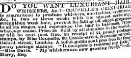 JlJ W 111 SKHRS , & o . ? -COlTl'MM . h ^ . V , « ' oV «»' roWl ' iu Biiarauteed to produce wliihkorii , iiiiiM «(¦ Mw . ^ , lllyi & c ., in two or tliroo weeks wiih « >» S cqk ( 5 r « y" «» Htroiitfthen weak hair , provont it « ftilHhk « 'ftia ,, o 5 s , fr <) . n In iillltb HtngeH , and roj ) roUiioo lIlt \ , " •;! ,,, hIhIii H '" wor | tl ' wlmtovcr oaiiHO . Prico in Sold by nH « l' «'" J " " " ,, v , ioHtwJB or < vill bo hoiH , \ nml free , on receipt ol -y ^ , , n ,,. Hircot , stamps , by MJmh Ooupollo , <»» ,, ^««' » l -: f / '' "" t " i » " ' " « ° fo ! ' W Oxford-sti-oot , London . A tpllot $ \ i d « »«» J » i ° , 0 , | ,, iy mir . penny itoHtniso Htami > H . " It o 0 '"! ' !* ^^ "" JfiS trcM- - —Mhtt Davis . " ' My whlakpra nro wow growinu Merry , Esq .