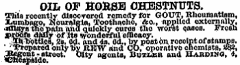 Oil * OF HQfcSE CHESTNUTS . Tlila recently discovered remedy for GOUT , Rhoumatism , XmmbagQ , Neuralgia , Tooth who , # o ,, nppHod externally , afllaya tho Pain and quickly cures tl » o woret oaflos . Fresh I > JCWfl ? dWIly of « b wonderful cflloaoy . , TO bottles , jja , < kJL and 4 s . Oa ., by post on rocolnt of stamps . '¦ yro pttredonfyUwjRWWand CO , oporativo ouomletfl . »§ 2 i Sfi Kent-atxoQt . City agents , Butjubr and . Hahdino , 4 > ^ UncftpBlae .