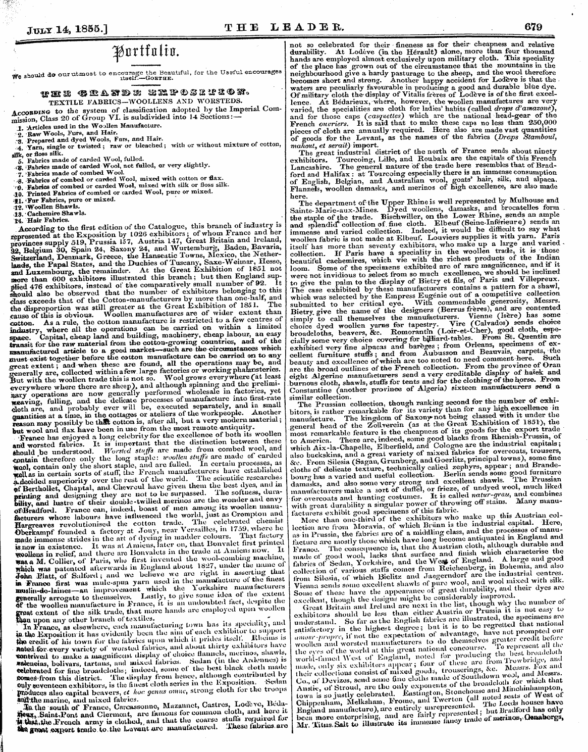 raffias <» as ;& srs & -3 s aa-ssis ^ iDS &^ paq & sro TEXTILE FABRICS—WOOLLENS AND WORSTEDS . According to the system of classification adopted by the Imperial Coramission , Class 20 of Group VI . is subdivided into 14 Sections : — 1 . -Articles used in the Wo alien Manufacture . 2 . Raw Wools , Furs , and Hair . S Prepared and dyed Wools , Fnrs , and Hair . ¦ 4 Yarn , single or twisted ; raw or bleached ; with or without mixture of cotton , silk , or floss silk . 5 Fabrics made of carded Wool , fulled . ' »] Fabrics made of carded Wool , not fulled , or very slightly . 7 ! ^ abries made of combed Wool . ¦ -8 * Fabrics of combed or carded Wool , mixed with cotton or flax . ' « . Fabrics of combed or carded Wool , mixed with silk or floss silk . 10 . Printed Fabrics of combed or carded Wool , pure or mixed . ; ' Fur Fabrics , pore or mixed . -12 . 'Woollen Shawls . < 13 . Gachemire Shawls . 1 * 4 . Hair Fabrics . According to the first edition of the Catalogue , this branch of industry is represented at the Exposition by L 026 exhibitors ; of whom France and her Sovinces supply 519 , Prussia 157 , Austria 147 , Great Britain and Ireland , 92 Belgium 30 , Spain 24 , Saxony 24 , and Wurtemburg , Baden , Bavaria , Switzerland , Denmark , Greece , the Hanseatic Towns , Mexico , the Netherlands , the Papal States , and the Duchies of Tuscany , Saxe-Weimar Hesse and Luxembourg , the remainder . At the Great Exhibition of lfiol not more than 600 exhibitors illustrated this branch ; but then England supplied 476 exhibitors , instead of tlie comparatively small number ot 92 . it should also be observed that the number of exhibitors belonging to this class exceeds that of the Cottou-manufacturers by more than one-half , and the disproportion was still greater at the Great Exhibition of 1851 . The cause of this is obvious . Woollen manufactures are of wider extent than cotton . As a rule , the cotton manufacture is restricted to a few centres of industry , where all the operations can be carried on within a limited space . Capital , cheap land and building , machinery , cheap labour , an easy transit for the raw material from the cotton-growing countries , and of the manufactured article to a good market—such are the circumstances which must exist together before the cotton manufacture can be earned onto any oreat extent f and when these are found , all the operations may be , and Generally are , collected within a few large factories or working phalansteries . f $ ut with the woollen trade this is not so . Wool grows every where Cat least everywhere where there are sheep ) , and although spinning and the prelimiiwiry operations are now generally performed wholesale in factories , yet ws avingT fulling , and the delicate processes of manufacture into first-rate SothaFe , and probably ever will be , executed separately , and in small quantities at a time , in the cottages or ateliers of the workpeople . Another reason may possibly be thft cotton is , after all , but a very modem material ; but wool and liax have been in use from the most remote antiquity . ¦ France has enjoyed a long celebrity for the excellence of both its woollen and worsted fabrics . It is important that the distinction betweea these should be understood . Worsted stuffs are made from combed wool , and contoin therefore only the long staple : woollen stuffs are made of carded * obl , contain only the short staple , and are fulled . In certain processes a , JSlas in certain sorts of stufT , the French manufacturers have established JSecTded superiority over the rest of the world . The scieutihc researches ofBerthoUe £ Chaptal , and Chevreul have given them the best dyes , and m ntuZm and designing they are uot to be surpassed . Ihe softness dura-Kv ^ Ld lustre of their double-twilled merinos are the _ wonder aud envy
