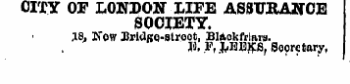 CITY OF LONDON LIFE ASSXTKANCE SOCIETY , , 18 , Now JJrltfKQ-Btroot , Blaokfrlaru . JS . F , . fc flQffg , Sooretary ,