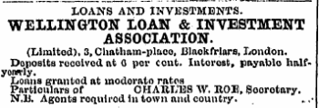 LOANS AND INVESTMENTS . WELLINGTON LOAN & INVESTMENT ASSOCIATION . ( Limited ) , 3 , Chatham-place , i 31 aokfrlars , London . Deposits received nt 0 por oont . Interest , payablo halfyowly . Loans grantod at inodorato rates Particulars of CHARLES W . ROU , Soorotary . N . li . Agonts roqulrod in town anil country .