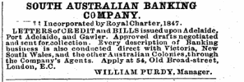 SOUTH AUSTRALIAN BANKING COMPANY . ?! IncorporatedbyRoyalCharter , 1847 . LETTERSof CREDIT and BILLS issued upon Adelaide , Port Adelaide , and Gawler . Approved drafts negotiated and sent for . aollection . Every description of Banking business is also conducted direct with Victoria , New South Wales , and the other Australian Coloiries , throngh tho Company ' s Agents . Apply at 54 , Old Broad-street , London , E . C . . WILLIAM PURDY , Manager .