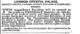 LONDON CRYSTAL PALACE . REGENT-CIRCUS , OXFORD-STREET AND GREATPOBTLASTDSTJREET . THIS magnificent Building will be opened to the public on WEDNESDAY , December 1 st , 1858 , for the sale of all kinds of useful and fancy Articles . It will contain the largest number of first-class Exhibitors of any Building in Europe . The Photographic Establishment ia the finest in London . The Aviary , Conservatory , General Refreshment Room , and Ladies' Private Refreshment Room , with Retiring Rooin attached , will be replete in their several departments . ' Applications for the remaining space are requested to be made forthwith .