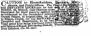 / CAUTION t «> Householders , B * n ) k 0 p «» v . vBfer *' -v : \ J ohants , and Public Olfioos . Tho Patenttf & VIgiig & kp } / and DEFIANCE LOCKS can bo had < $ &/ tf- & £ Q 3 ?]® i ~ - \ * ! - RIDGHD , B 2 . Strand , nowOlmrlnB-oroBS . ^ h ^ iSBnltfSyF ^ ' ' important for thoir soourlty against bul ^ i « ' | l ^ f ^ fflJ | MgK <»^ J > " asevidoncod in tho fraudulont at ! tompteJ | P'i ^ feMgSs ^ W ^ V Crystal Pftlaoo . in August , ie 54 , by Joh )« « o *^ atpffl « g ^ M ^ , ¦ 'mx ^ i ^ r ^ " ^^^^^ ; 2 ) oov KntobOB , $ ?*• ML- oft "' -