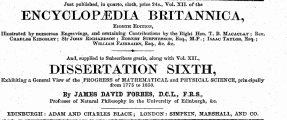 t-E J S ust pubushed , in quarto , cloth , price 24 s ., Vol . XII . of the ENCYCLOPEDIA BRITANNICA , Eighth : Edition , Illustrated by numerous Engra-vings , and containing Contributions by the Eight Hon . T . B . SlACAtTLA . r ; Rev . Chakles Kimgslev ; Sir John Ricmaedson ; Robert Stephekson , Esq ., M . P . ; Isaac Tatix > b , Esq . ; WIIXIA 3 I FAIRBAIRN , Esq ., & C . & C . And , supplied to Subscribers gratis , along with . "Vol . XII ., DISERTATION SIXTH , Exhibiting a General View of tlie PROGRESS of MATHEMATICAL and PHYSICAL SCIENCE , principally from 1775 to 1850 . By JAMES DAYID FORBES , D . C . L ., P . R . S ., Professor of Natural Philosophy in the University of Edinburgh , & c . EDINBURGH : ADAM AND CHARLES BLACK ; LONDON : SIMPKIN , MAESHALL , AND CO .