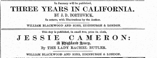 = = In January J S will be published C THREE YEARIN ALIFORNIA . BY . . BORTHWICK . In octavo , with . Illustrations by the Author . WILLIAM BLACKWOOD AND SONS , EDINBURGH & LONDON . This day is published , In small 8 vo , price 5 s . cloth , : : J E S B IE O ^ M ^ f ^ i $ Iantt S > torg . By THE LADY RACHEL BUTLER . WILLIAM BLACKWOOD AND SONS , EDINBURGH & LONDON .