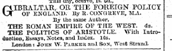 uay , ocravo , . uu ., GIBRALTAR ,. OR THE FOREIGN POLICY OF ENGLAND . Ey R . COXOllEVE , M . A . _ By tho same Author , THE ROMAN EMPIRE OF THE WEST . 4 s . THE POLITICS OF ARISTOTLE . With Introduction , Essays , Notes , and Index . lGs . London : John W . 1 \ vrkeli and Sox , AVest Strand .