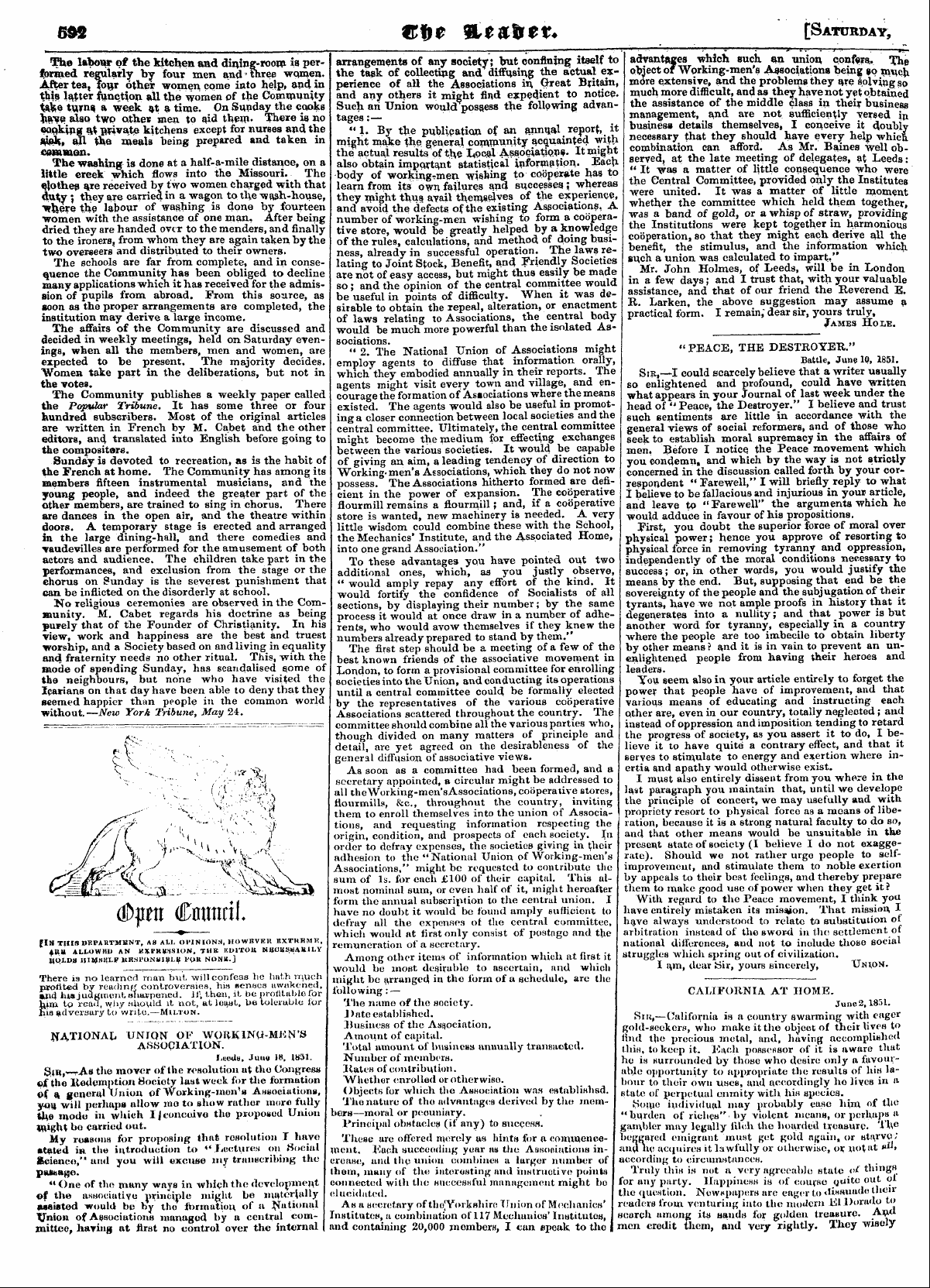 NATIONAL UNIQN OF WORKINU-MUN'S ASSOCIATION . Letnla , Juno 18 , ( 851 . 8 m , —rA » the mover of the resolution at the Congresa © i tho ltodemptitm Society lust week for the formation oC a . general Union of Working-men ' s AaBOcintionu , you will perhaps allow mo to show ruthor more fully the mode in which I / concoivo the proponed Union Wight bo carried out . My reasons , for proposing that resolution I have tnted in the introduction to * ' Lectures on Social Science , " y ou wiil excuse my tranncribing the patuago . " One of the many ways in which the development © f the associative principle mig ht be materially assisted would be b y tho formation of u Rational TJnion of Association !* managed by « centrul committee , haying at ftrat no control over the internal