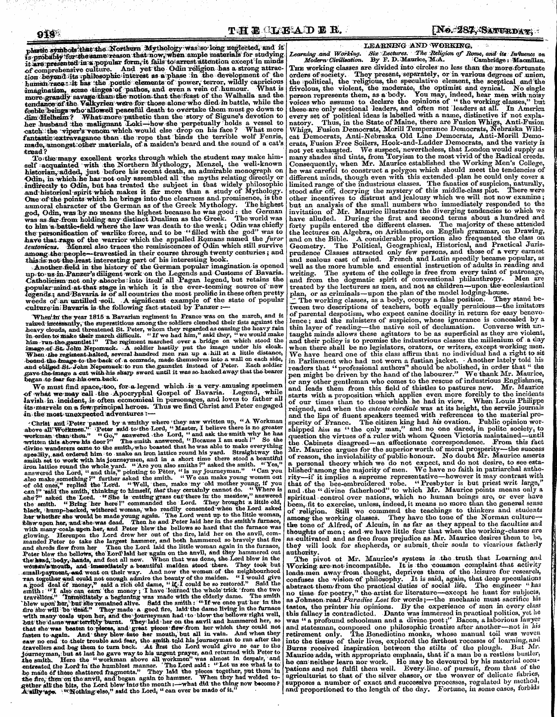 been , fit to exercise , unless , indeed , it means no more than tho general sense of religion . Still wo commend the teachings to thinkers and students among the working classes . They have the tone of the Norman culturethe tone of Alfred , of Alcuin , in as far as they appeal to the faculties and thoughts of men ; and we have little fear that when the working-classes are as'Cultivated and as free from prejudice as-Mr . Maurice desires them to be , they will look for shepherds , or submit , their souls to vicarious fatherly authority . The pivot ot Mr . Maurice ' s system is the truth that Loarnmg and Working are ' not ' incompatible . It is the common complaint that activity leads i men away from thought , deprives them of the leisure for research , confuses tho vision-of philosophy . It is said , again , that deep speculations abstract thencvfrom the practical duties of social life . The engineer " has no time for poetry , " the artist for literature—except he hunt for subjocts , hia