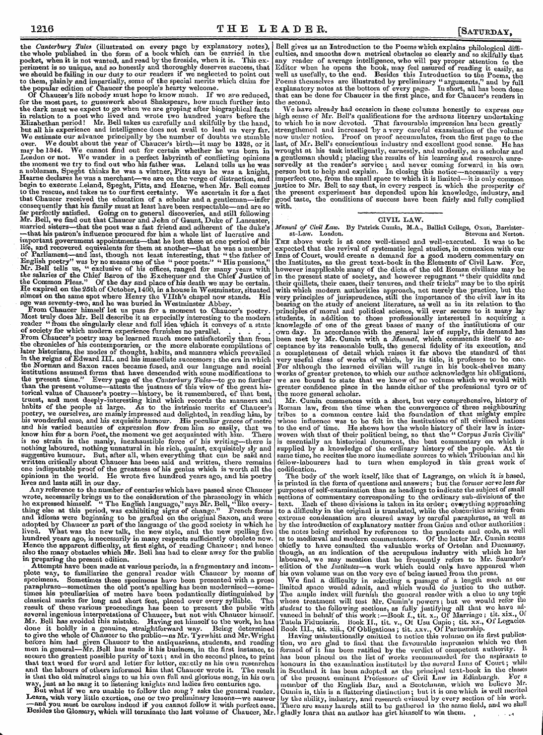 Bell gives us an Introduction to the Poems which explains philological difficulties , and smooths down metrical obstacles so clearly and so skilfully that any reader of average intelligence , who will pay proper attention to the Editor when he opens the book , may feel assured of reading it easily , as well as usefully , to the end . Besides this Introduction to the Poems , the Poems themselves are illustrated by preliminary " arguments , " and by full explanatory notes at the bottom of every page . In snort , all has been done that can be done for Chaucer in the first place , and for Chaucer's readers in the second . We have already had occasion in these columns honestly to express our high sense of Mr . Bell ' s qualifications for the arduous literary undertakin g to which lie is now devoted . That favourable impression has been greatly