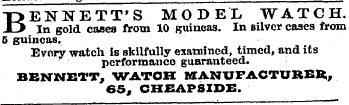 ENNETT'S MODEL WATCH . In gold cases from 10 guineas . In Bilver cases from 5 guineas . Every watch is skilfully examined , timed , and its performance guaranteed . BENNETT , WATCH MANUFACTURER ,, 65 , CHEAPSIDE .