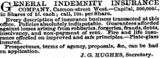 r ^ E NERAL INDEMNITY SURANCE \ JC COMPANY , Cannon-street West . —Capital , 500 , 000 / ., in Shares of 51 . each ; call , 10 s . per Share . Every description of insurance business transacted at this office . Policies absolutely indisputable . Guarantees afforded against losses arising from robberies , forgeries , frauds , debts , insolvency ^ and non-payment of rent . Fire and life insurance effected on improved and safe principles . —Plate-glass insured . , . _ . "Prospectuses , terms of agency , proposals , Sec , can be had on application . HUGHES , Secretary .