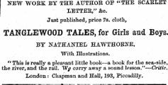 NEW WORK EY THE AUTHOR OF "THE SCARLET LETTER , " & c . Just published , price 7 s . cloth , TANGLEWOOD TALES , for Girls and Boys , BY NATHANIEL HAWTHORNE . With Illustrations . " This is really a pleasant little book—a book for the sea-side , the river , and the rail . W £ carry away a sound lesson . "—Critic . London : Chapman and Hall , 193 , Piccadilly .