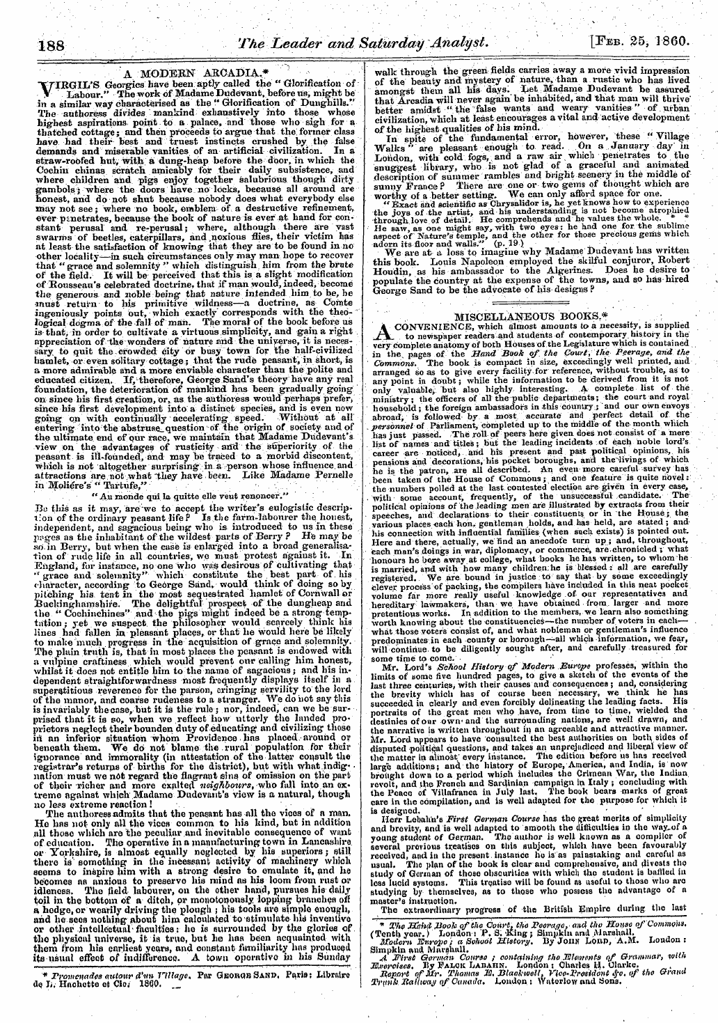 A MODEEN ARCADIA , * ¦ ifTIJBGIIi'S . Georgics have been aptly called the " Glorification of V Labour . " The work of Madame Dudevant , before \ is , might be in a similar way characterised as the " Glorification of Dunghills /' Tlie authoress divides mankind exhaustively into those whose hig-best aspirations point to a palace , and those who sigh for a thatched cottage ; and then proceeds to argue that the ! former class Lave had their best and truest instincts crushed by the false demands and miserable vanities of an artificial civilization . In a straw-roofed hut , with a dung-heap before the door , in which the Cochin chinas scratch amicably for their daily subsistence , and where children and . pigs enjoy together salubrious though dirty gambols ; where the doors have no locks , because all around are honest , and do not shut because nobody does what everybody else
