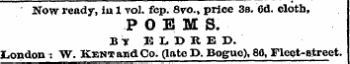 Now ready , iu 1 vol . fcp . 8 vo ., price 3 s . Od . cloth , POEMS . Sir JJLDRKD . London : W . Kent and Co . ( late P . Boguo ) , 80 , Fleet-street .