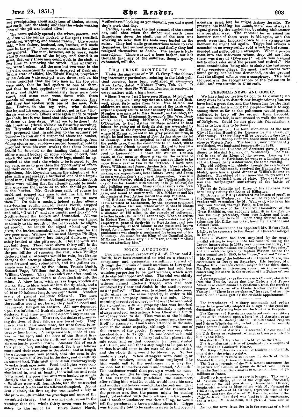 THE IRISH CONVICTS OF ' 48 . Under the signature of " W . C . Gray , " the following interesting particulars , relating to the Irish political convicts , have been published in Saunders ' s News Letter , dated " Hobart Town , Feb . 27 . " It will be seen that Sir William Denison is resolved to carry matters with a high hand : — " Since I wrote last I have seen Messrs . Mitchell and Martin ; they are living together at a place called Bothwell , about forty miles from here . Mrs . Mitchell and children are soon expected , as none of the Irish exiles expect a speedy return to their country and home . Mr . Meagher was married to Miss Bennett , on Saturday , the 22 nd inst . The Lieutenant-Governor ' s ( Sir Wm . Denison s ) order , sending M'Manus , O'Dogherty , and O'Donohoe , to Port Arthur for three months at hard labour , for going out of their district , was overruled by the judges in the Supreme Court , on Friday , the 23 rd , where M'Manus appeared in his gray prison uniform , in which he had been working at Port Arthur since the 1 st of January . After his acquittal he had to walk , amidst the public gaze , from the courthouse to an hotel , where he had many friends to meet him . He had to borrow a suit of clothes , in order that he could at once proceed to Launceston . I heard Sir William Denison state , at the monster dinner given on the arrival of