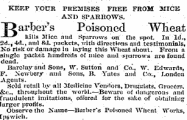KEEP YOUR PREMISES FREE FROM MICE AXI ) SPARROWS . XJ ' arber ' Poisoned Wheat - * r' ' kills Slice and Sparrows on the spot . In Id ., 2 d ., 4 d ., and 8 d . packets , with directions and testimonials , No risk or damage in laying this Wheat nboul . From a single i ) ackex hundreds of mice and sparrows are found dead . ' . ¦ . " - ' . . ' Barclay and Sons , \ V . Sutton and Co " , W . Edwards , F . Newbery and Sons , B . Yates and Co ., London Agents . Sold retail by all Medicine Vendors , Druggists , Grocers . & e ., throughout the world . —Beware of dangerous and fraudulent imitations , offered" for the sake of obtaining larger profits . ¦ . - ... Observe the Name—Barber ' s Poisoned Wheat Works , Ipswich .