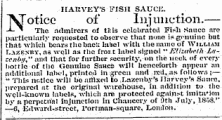 HARVEY'S FISH . SAUCE . Notice of Injunction . — The admirers of this celebrated Fish Sauce are particularly requested to observe that none is genuine but that which " bears the bade label with the name of William Laze ' sby , as well as the front label signal " Elizabeth Luzeiibtf , " and that for further security , on the neck of every bottle of the Genuine SaHce will henceforth appear an additional label , printed in green and red , as follows ;—. ' " This notice will be affixed to . Lazenby ' s Harvey ' s Sauce , prepared at the original warehouse , in addition to the well-known labels , which are protected against imitation by a perpetual injunction in Chancery of !) th July , 18-08 . " . —G , Edward-street , Portman-square , London .