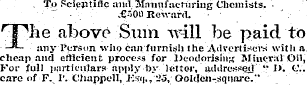 . To Pciejitiflc and Manufacturing Chemists . . £ 500 Reward . 'Tphe above Sum will be paid to - * - any Person who can furnish the Advertisers with a cheap and efficient process for Deodorising Miu ' c . riil Oil , For full iiartieu . lars apply by letter , addressed " i > . C .. care of F . P . Chappell , J-Ihti | ., 25 , Qolden-sqnare . "
