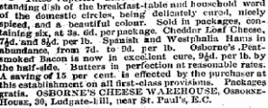 standing dish of the breakfast-table and household word of the domestic circles , being delicately cured , nicely spiced , and a beautiful colour . Sold m packages , containing six , at 3 s . « d . per package . Cheddar L oaf Cheese , 7 £ d . and 8 Jd . per lb . Spanish and Westphalia Hams in abundanceTirom Td . to 9 ( 1 . per lb . Osborne ' s . Peatsmoked Bacon is now in excellent cure , 9 £ d . per lb . by the half-side . Butters ill perfection at reasonable rates . A saving of 15 per cent , is effected by the purchaser at this establishment oh all first-class pro visions . Packages gratis . OSBORNE'S CHEESE WAREHOUSE , Osbokne-House , SOj I-udgate-hill , near St . Paul ' s , EC .