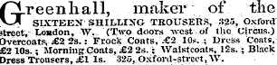 Greenliall , maker of the SIXTEEN SHILLING TROUSERS , -S 25 , Oxford street , Lomdon , W . ( Two doors west of the Circus . ) Overcoatsi ^ £ 2 2 s . : Frock Cpats , £ 2 10 s . ; Dress Coats , £ 2 10 s . ; Morning Goats , £ 2 2 s . ; Waistcoats , ISs . ; Black Dress Trousers , £ . 1 Is . 325 , Oxford-street , W .
