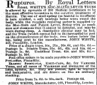 Euptures . By JKojal Letters Patent WHITE'S MOC-MAINE LEVER TRUSS is allowed by up ^ vards of 200 Medical Gentlemen to be - the most effective invention in the curative treatment of Hernia-. The use of steel spring ( so hurtful in its effects ) ¦ is here avoided , a . soft bandage being worn round the body , while the requisite resisting power is . -supplied ty the Moc-Maln and " Patent ; Lever , ntting with so . much ease and closeness that it cainiot be detected , and maybe worn during sleep . A descriptive circular may be had , and the Truss ( which cannot fail to fit ( forwarded by post ¦ on the circumference of tlie body , - two inches below the hip , being sent to the manufacturer , JOHN WHITE , 221 , Piccadilly , Iiondon . Price of a single truss , Ifis ., 21 s ., 2 CS . fid , and 31 s . Gd . ^ Postage Is . Double Truss , 31 s . Gd ., 42 s . and . Vis . <> d . — Postage Is . 8 d . Uihbiiical Truss , 42 s . and S 2 s . Gd . — Postage Is . lOd . Post-offico orders to be made payable to JOHN WHITE , Post-office , Piccadilly . Elastic Stockings , Knee-Caps , & c . for Varicose Veins , and all eases of " Weakness and Swelling of the XxbV ; ' Sprains ' , " % c : They'ar - e ^ ftrtfiTS—ilglltrin - territrPr and inexpensive , and arc drawn on like an ordinary stocking . Price from 7 s . Cd . to IGs . each . Postage Gd . JOHN WHITE , Manufacturer , 228 , Piccadilly , London