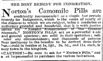 THE BEST REMEDY FOR INDIGESTION . Norton ' s Camomile Pills are confidently rocomineiide 1 us a simple hut certain remedy for Indigestion , which is the cause of nearly all the diseases to which we ary . subject , beiiKf a lnedioine mo uniformly grateful and beneficial ,. ' that it iw withj list ice called "" th' 6 rt 'Natui'iil SfftSiTgTITeTfcT Of Ihc lltrrrnrrr Stomach . " NORTON'S' PILLS act as a powerful tonic and general aperient ; arc mild in their operation ; safe ndcr any , circinnstariccs ; and , thousands of persons " ear tcsthnoiiy to the benefits to bo derived from thoir h so . _ Sold in bottles at Is , 1 ^ 1 ., 2 s . !» d ., nml Us , eheh , in uery town in the kingdom . vCAUTION!—Bo sure to ask for " Norton ' s Pillp , " and n ot l ) ei > ersuaded to puruharc the various imitations .