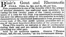 Bla ir ' s Gout and Kheunuitic PILLS . Price , Is . 14 < I . and 2 s . Ucl ., pcr box . This preparation is one of the bonetlts wliich the Hcicncfl of modern chemistry has conferred upon mankind ; for during the first twenty years of the prosciit ^ ccntiiry to speak of a cure for tlio Gout was considered a romnncoj but now the cuicncy and snfoty of thismedlcihc is po fully demonstrated , by unsolicited testimonials from persons in every rank of life , that public opinion proclaims this as one of the most important discoveries of tlie present ngi ' , These Win require no rostrulnt of diet or confinement during their use , and are certain to prevent tlio disease attacking any vital part . Sold by nil medicine vondors . Ob . iorvo " Thomas ProtU , 220 , Strand , London , " on tlio Government Stamp .