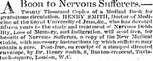 A Boon to Nervous Sufferers . ——.: Twenty ' Thousand ( Ji > pk'S of a Medical Hook-for gratuitous circulation . IIKNRV SMITH , Doctor of Medicine of the Koyjil Un . ivorsity of Jena , itc ,, wlio li : is devoted liftccn years to the study and treatment of Nervous Debility , Loss of Memory , nnd Indigestion , will send free , for -benefit , of Nervous SulVorprs , Ji . copy of fiio Now ? . Ie ( . ! iciil Guide , with necessary instructions by which sufferers-inny obtaiH a curt ' . Post-free , on receipt of ii stamped dirwtecj envelope , by Dr .- Henry Smith , S , ' Huiton-ereseent , Tavistoelv-pfjuare , Loni ' wn , W . < . ' . .