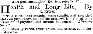 Just published , Third Edition ; price l . s . fid . Health and Long Life . By E .. EPPS . "This little book contains some sensible nnd practical hints on physiology , and on ' tho preservation of health by attention to physical and mental influences . "— -Lftiu'nry GaxetW . Published by Pipeii , SiEi'HEN .-ioN , and Si'hnce , 23 , Patornnwter-row .