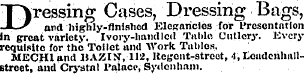 Dressing Cases , Dressing Bags , and highly-finished Elegancies for Presentation in great variety . Ivory-handled Table Cutlery . Every requisite for thi Toilet and Work Tables . MECHland IJAZIN , 112 , Regent-street , 4 , Loadenhalletreet , and Crystal Palace , Syilenhain .