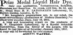 Prize Medal Liquid Hair Dye . , Only ono application . Instantaneous , I ude ' lihle , Harmless ; and Scent less . In canes , post free , 3 s . 3 d . and 6 s ., direct from E . V . LANG DALE'S Laboratory , 72 , Hatton Garden , London , K . C . " Mr . l > angdalo ' d preparations arc , to our mind , tlie most extraordinary productions of Modem Chemistry . " — Illustrated London News , July 16 . 185 JL A long and interesting leport on tho products of E . F . Langdalo ' s Laboratory , by a Special Scientific Commission , from tho Kditor ot tho lancet , will bo found , in that journal of Saturday , January 10 th , 1837 . A copy will bo forwarded for two stamps . AGHNTK WANTED .