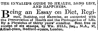 THE INVALID'S GUIDE TO HEALTH , LONG LIFE , ' AND HAPPINESS . ' Bein g- an Essay on Diet , Eeginwn , nathlnpr . and Kxeirelno , as corineotod wltli tho 1 'renervntlon of Health nnd tho Prolongation of Llfu . By a Physician of thirty years' Htnndliifr , Sent froo on rccolpt of six stamps , by Wm . HILL , Ksq . JM . A ,, U 7 , Alfrod-plnca , nedford-nnuaro , London ,