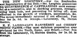 THE NEW DISCOVEHY . —For tho Reparation and Roprortuctiou of tho Hair . —Mr . Langdalo guarnntceR his QUINTESSENCE of OANTHAT ( IDKS mo « t successful as a restorative , nlno In checking groyneus , (< trengtlienlng weak hair , and preventing Its falling off ; most effectual in tho growth of whiskers , moustachlop , & o . Tho money immediately roturnod If not effectual . Post froo for Us . ( Id . in Stamps . —Laboratory , 72 , ITntton Garden , 13 . P . LANODALIVS RASPBERRY and OHERHY TOOTII "" P ^ - ' ~' 1 ' " "" inojit delicious preparation ovot pro'lucod for tho Teeth , Gums , and Breath . —Post freo from tho Laboratory , Vi , Hatton Gardou , for Is . Sd . in stamps .